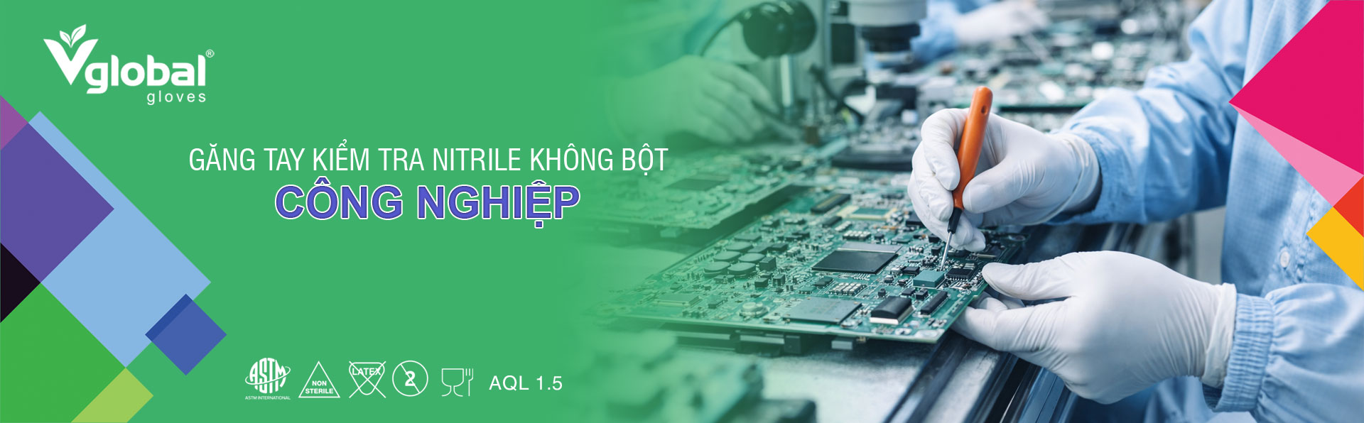 Găng tay nitrile Vglobal được sản xuất theo tiêu chuẩn quốc tế, mang đến độ bền vượt trội, chống hóa chất tốt và an toàn tuyệt đối cho người dùng. Chất lượng ổn định và khả năng ứng dụng linh hoạt, Vglobal hiện đang được tin dùng rộng rãi trong nhiều lĩnh vực: